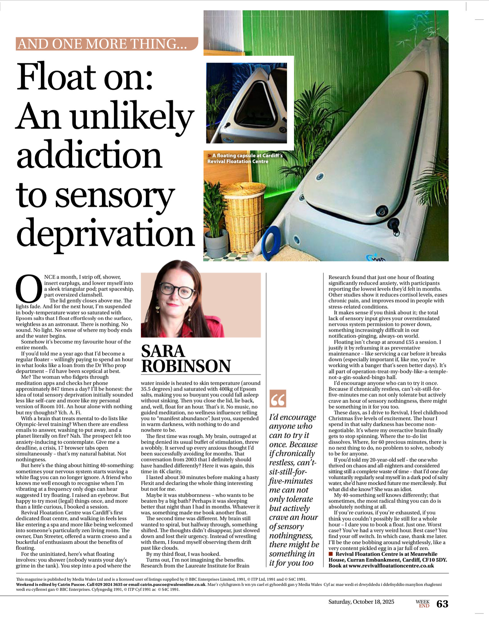 Revival Floatation Centre is at Meanwhile House, Curran Embankment, Cardiff, CF10 5DY. Book at www.revivalfloatationcentre.co.uk.